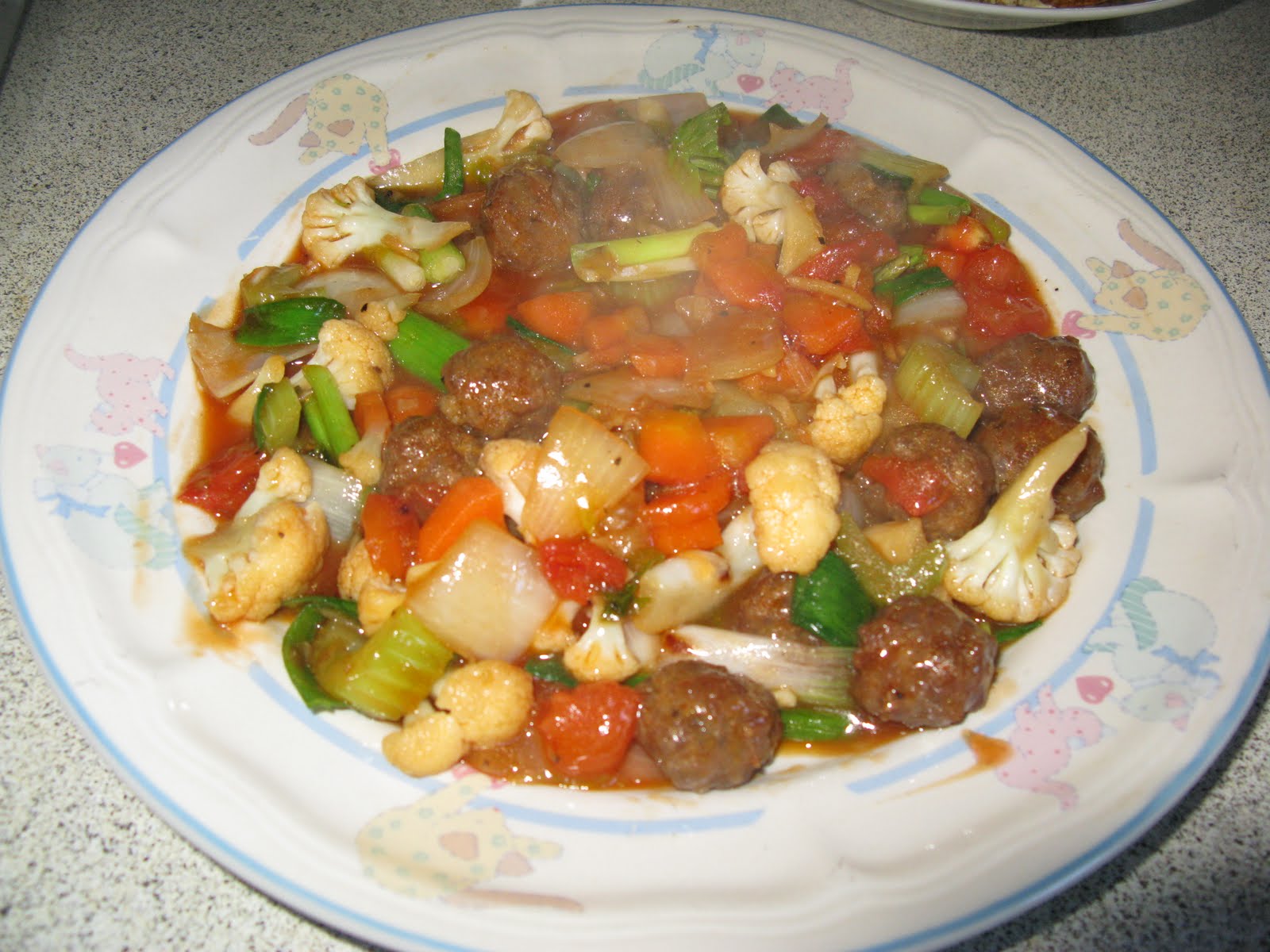 ဒယ္အိုးကို မီး medium ထားၿပီး ေစာနက ၀က္သားလံုးေၾကာ္ထားတဲ႔ဆီ စားပဲြဇြန္း ၂ဇြန္းခန္႔ထည္႔ပါ။ ဂ်င္းအေခ်ာင္းေလးေတြ အရင္ထည္႔ပါ။ ၾကက္သြန္ၿဖဴထည္႔ပါ။ ၾကက္သြန္ၿဖဴ နီညိုေရာင္သန္းလာရင္ ဟင္းသီးဟင္းရြက္ေတြထဲက ပိုၾကာၾကာေၾကာ္ရမဲ႔ မံုလာဥနီနဲ႔ ပန္းေဂၚဖီအရင္ထည္႔ေၾကာ္ပါ။ ပဲငံၿပာရည္အခ်ိဳရည္ ၂ဇြန္း၊ ဟင္းခတ္မွဳန္႔ တစ္ဇြန္း တို႔ကိုလည္း ထည္႔ေမႊေပးပါ။ ခဏေနရင္ၾကက္သြန္နီ၊ တရုတ္နံနံ ခရမ္းခ်ဥ္သီးတို႔ိကိုပါထည္႔ပါ။ အသီးအရြက္ေတြ က်က္ခါနီးမွာ ၀က္သားလံုးထည္႔ပါ။ ငရုပ္ေကာင္းထည္႔ေမႊေပးပါ။